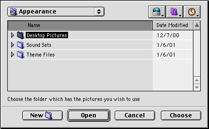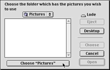 You will be asked to find the folder that contains the pictures you would like to use. Just use the standard file dialog to navigate to the folder you would like to use, and click on the choose button at the bottom. Under Mac OS 9 or later, you will see the more modern Navigation Services dialog.