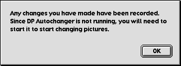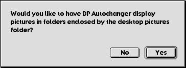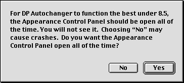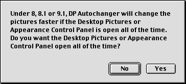 Using DP Autochanger Its not hard to use DP Autochanger. When you first start DP Autochanger, you will be asked about leaving the Desktop Picture Control Panel (8 and 8.1) or Appearance Control Panel (8.5 and later) open at all times. Under Mac OS 8, 8.1 and 9.1, this is an option that allows the pictures to change more quickly, so you will see the following dialog:
