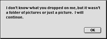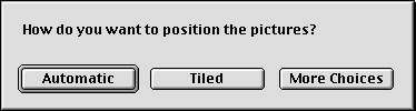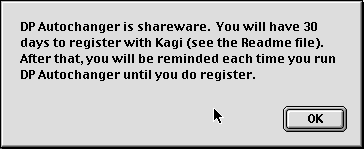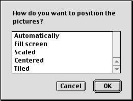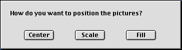 Since DP Autochanger is shareware, the first time you start it, you will see this message: As the message says, this will not bother you again for 30 days, and then a request for the registration key will appear each time you start DP Autochanger. See below for registration information. Drag & Drop Operation Next you will be asked to select the alignment you would like to use. If you are running a System prior to 8.5, you will see the following dialogs. You can choose to have Desktop Pictures do it automatically, to have the pictures tiled on your screen, or you can choose one of three other options. With Mac OS 8.5 and later, you will be able to make your alignment selection from one dialog. Once you choose an alignment, the same one will be used for all pictures in the folder. All of these preferences will be saved for you, so you will not be asked the next time that you run DP Autochanger. You can change them using the DP Autochanger Editor.