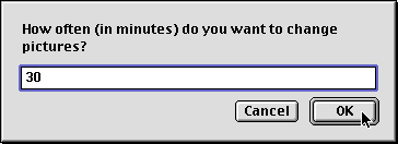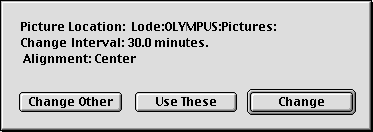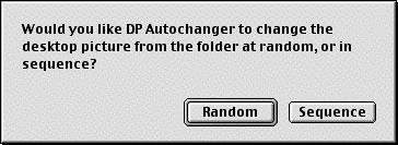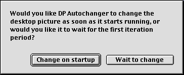 You will then be asked for the interval, in minutes, that you would like to pass before the picture is changed. Type in the minutes (in numerals), and click the “OK” button. You can enter a number less than one. Next you will be asked to select the alignment you would like to use. If you are running a System prior to 8.5, you will see the following dialogs. You can choose to have Desktop Pictures do it automatically, to have the pictures tiled on your screen, or you can choose one of three other options. With Mac OS 8.5 and later, you will be able to make your alignment selection from one dialog. Once you choose an alignment, the same one will be used for all pictures in the folder. You have the option to have DP Autochanger change the desktop picture as soon as it starts running, or you can have it wait until the first iteration. You will be asked to decide whether you want DP Autochanger to start each time you start your computer. If you select “Yes”, an alias to DP Autochanger will be created in your startup items folder, and you will not be asked again. If you select “No” you will be asked this question each time you run DP Autochanger. If you choose “Dont Ask Again”, the alias will not be made, and you will not be asked. If you change your mind later, and decide that you do want to have DP Autochanger start automatically, you can reset this in DP Autochanger Editor. All of these preferences will be saved for you, so you will not be asked the next time that you run DP Autochanger. You can change them using the DP Autochanger Editor.