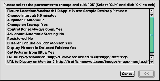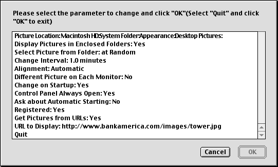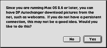 Under 8.6 and later, DP Autochanger can download pictures from the network. If you do not have a persistent connection to the net, that is, if you have to dial up to get to the Internet, I dont recommend that you use this feature. If you do, you will either be connected to the net and stay connected until you explicitly disconnect (if you have your PPP Set up to connect when TCP/IP applications start up), or DP Autochanger will not display a new picture (if your PPP Set up does not connect automatically).