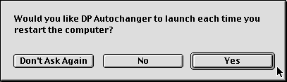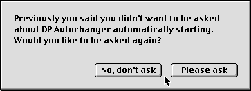 Next,you will see the display of your preferences. Here you can choose to use the current preferences, change one of the three displayed preferences, or change one of the undisplayed preferences, which are registration and automatic launch. If you have registered, and if you did not choose “Dont Ask Again” when asked about launching every time you start your computer, the “Change Other” option will not be presented. Selecting “Change Other” will lead to one or two other questions, depending on your situation. If you have not yet entered your registration key (see below), you will be asked for it. When you register and enter the correct key, DP Autochanger will not bother you nor will you be asked in the Editor. If you chose not to have DP Autochanger automatically launch, and you chose “Dont Ask Again”, you will see this dialog. If you would like the opportunity to have DP Autochanger ask you about starting automatically, click on “Please ask”. When you have answered the questions that appear you will be returned to the standard dialog for the Editor. If you choose “Change”, you will see the next dialog. You can choose one of the three items to change. They each lead to the same questions which you answered when you first started DP Autochanger (see above). No matter which you choose, when you are done making your change, you will return to the opening, and be allowed to change something else. When you choose “Use These”, you will end your editing session. The preferences will be written out. If DP Autochanger is running, you will see: